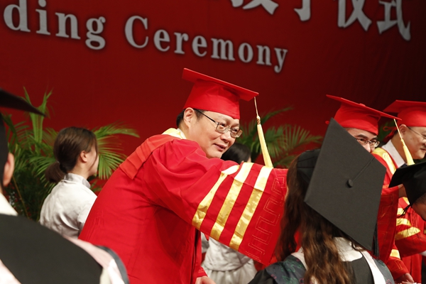 在下午的学士学位授予仪式上,校领导班子成员、教师代表为获得学士学位的学生正冠拨穗、颁发学位证书并合影留念。